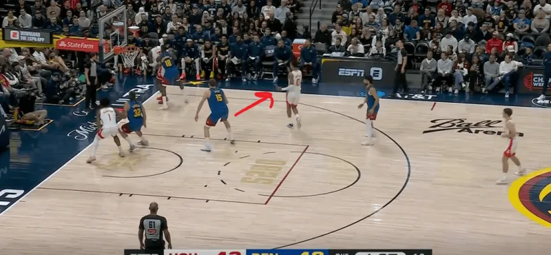 火箭进攻被逼至底线附近,约基奇及时提上封锁了小史密斯的接球线路: