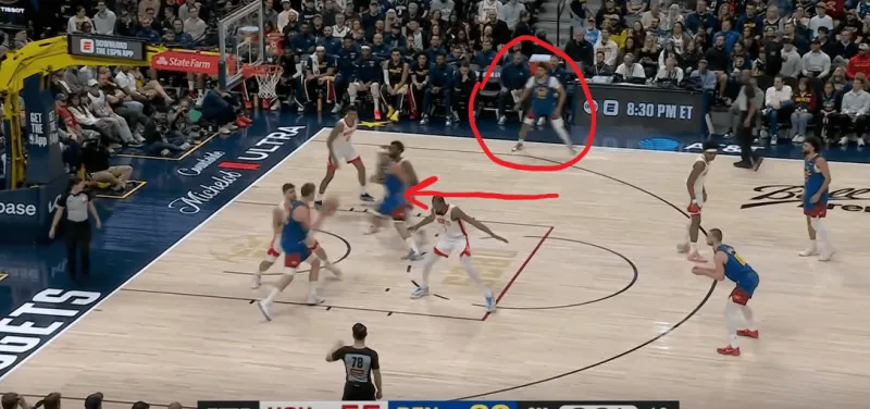 掘金阵地战为穆雷设计的横向zoom发起,由布劳恩设置掩护再和约基奇手递手发起,穆雷选择拒绝布劳恩掩护直接切入,约基奇心领神会直塞穆雷反跑空切扣空篮得分: