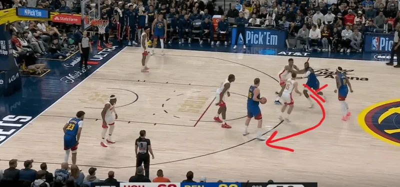 约基奇外弹接球,就近的史密斯刷卡防守限制其出手,约基奇再次和约翰逊完成默契配合,后者向左侧移动形成空位: