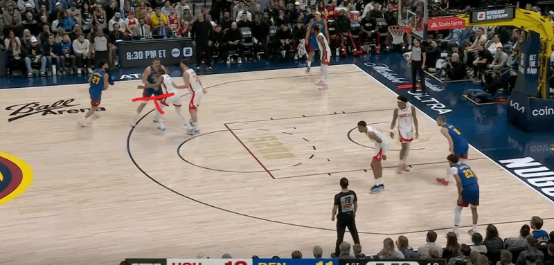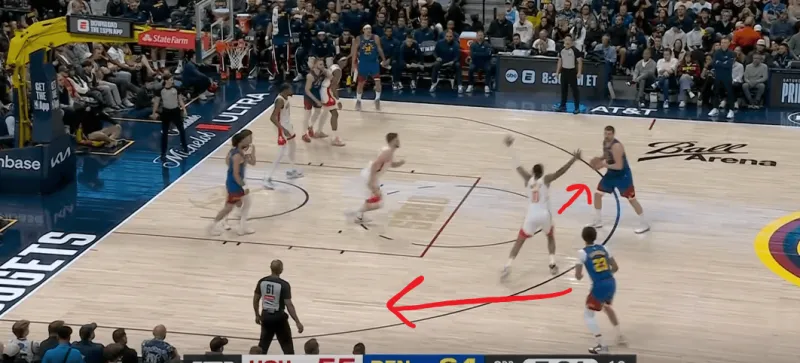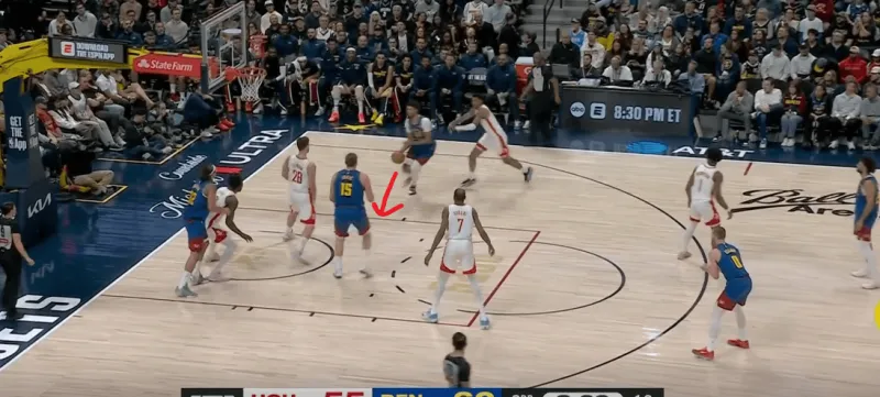 约基奇外弹接球,就近的史密斯刷卡防守限制其出手,约基奇再次和约翰逊完成默契配合,后者向左侧移动形成空位: